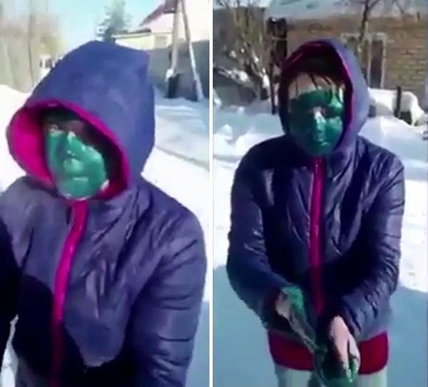 Chưa dừng ở đó, khi cô gái đã thực hiện việc làm quá đáng trên và dùng hai bàn tay để bôi đầy sơn xanh lên mặt, "chú Murat" lại tiếp tục ra lệnh cho cô nói những câu khó nghe trước ống kính máy quay.
