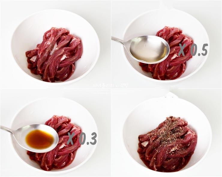 Thịt bò thái miếng con chì, ướp thịt với 7ml rượu, 5ml nước tương và một ít hạt tiêu rồi trộn đều.
