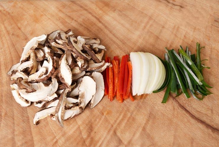 Chuẩn bị phần nấm và rau củ: Nấm hương ngâm nở thái miếng vừa ăn; Ớt sừng thái sợi; Hành tây thái lát; Hành lá cắt khúc ngắn 5cm.