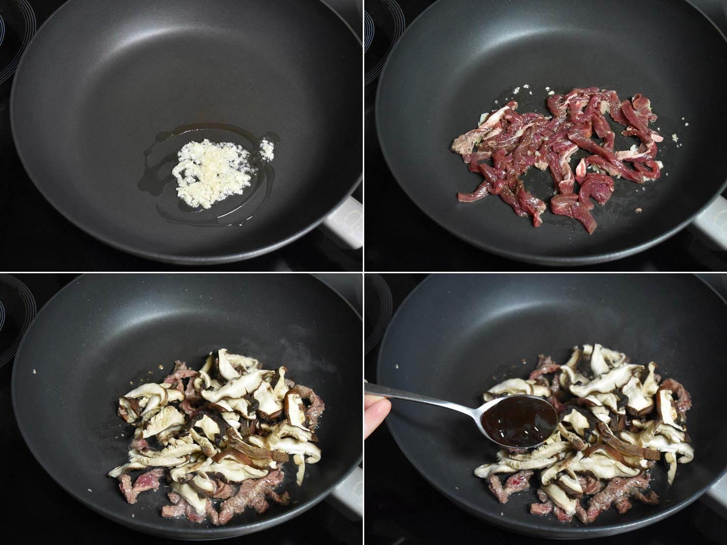 Đun nóng 30ml dầu ăn trong chảo, cho tỏi băm vào xào thơm. Tiếp đó cho thịt bò vào xào sơ qua, tiếp đó thêm nấm hương vào xào chung. Bạn nêm dầu hào và 7ml nước tương vào đảo đều cho thịt và nấm ngấm gia vị.