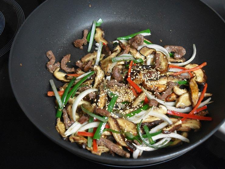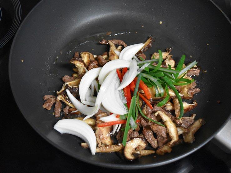 Khi thịt và nấm chín bạn thêm hành tây, hành lá và ớt sừng vào đảo qua rồi tắt bếp.