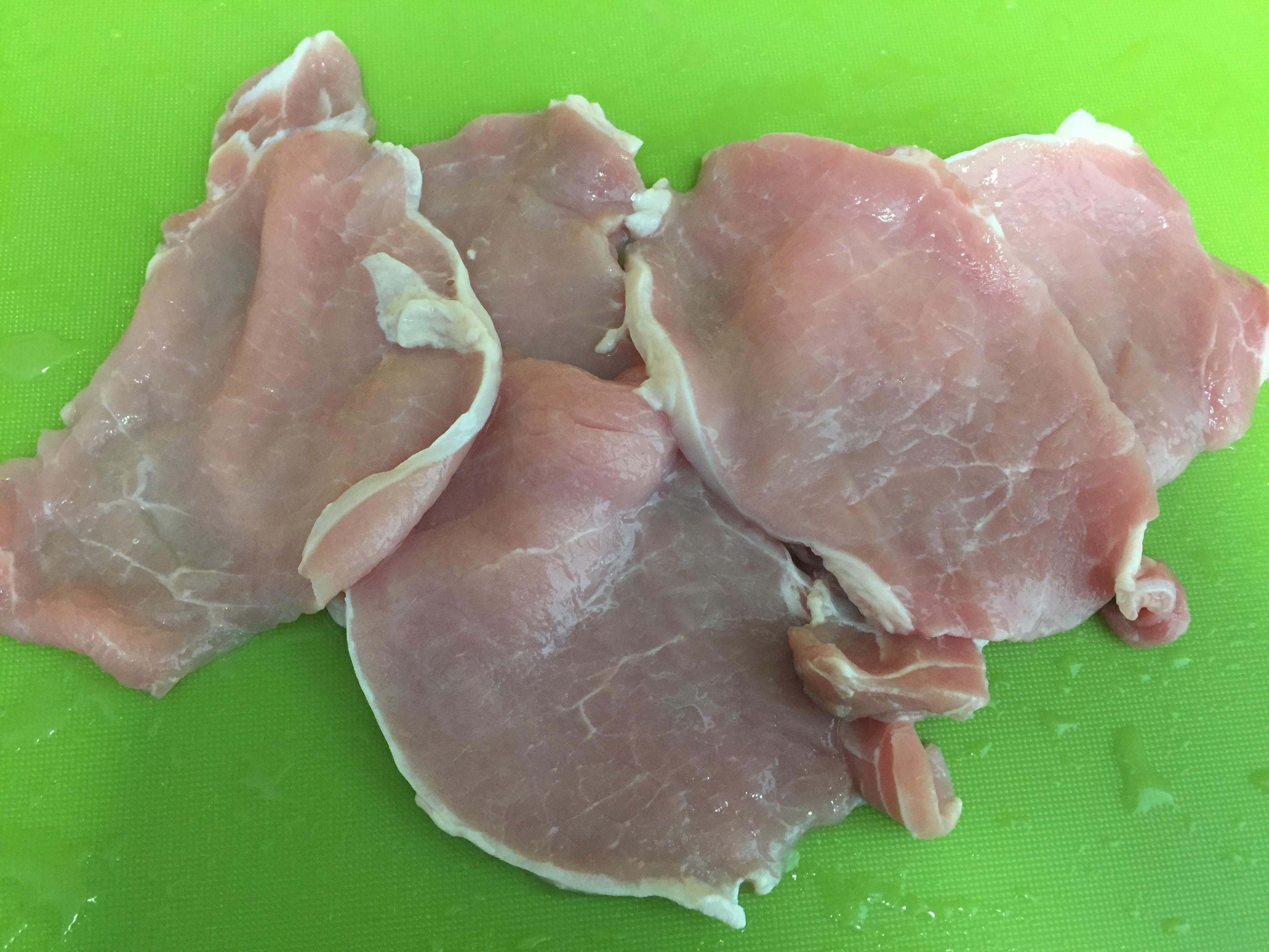 Thịt thăn heo rửa sạch, thái miếng to bản dày khoảng 0,5-0,7cm. Sau đó ướp với chút muối.