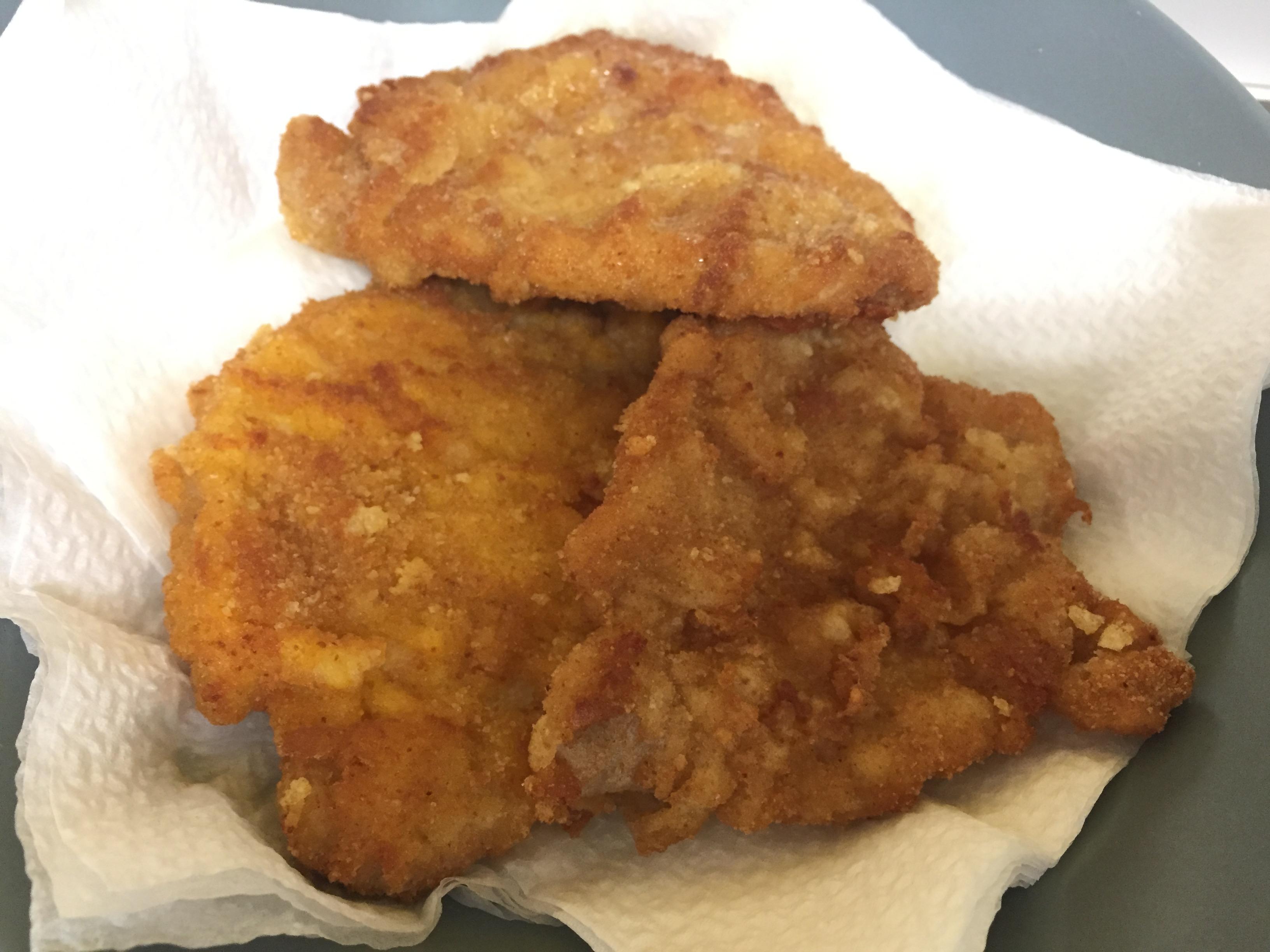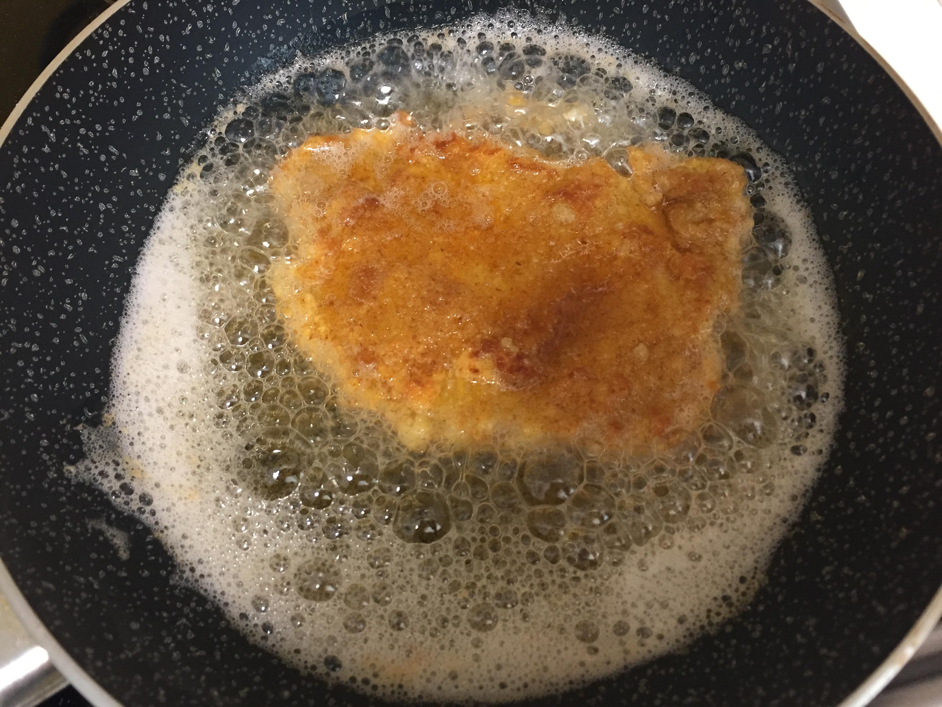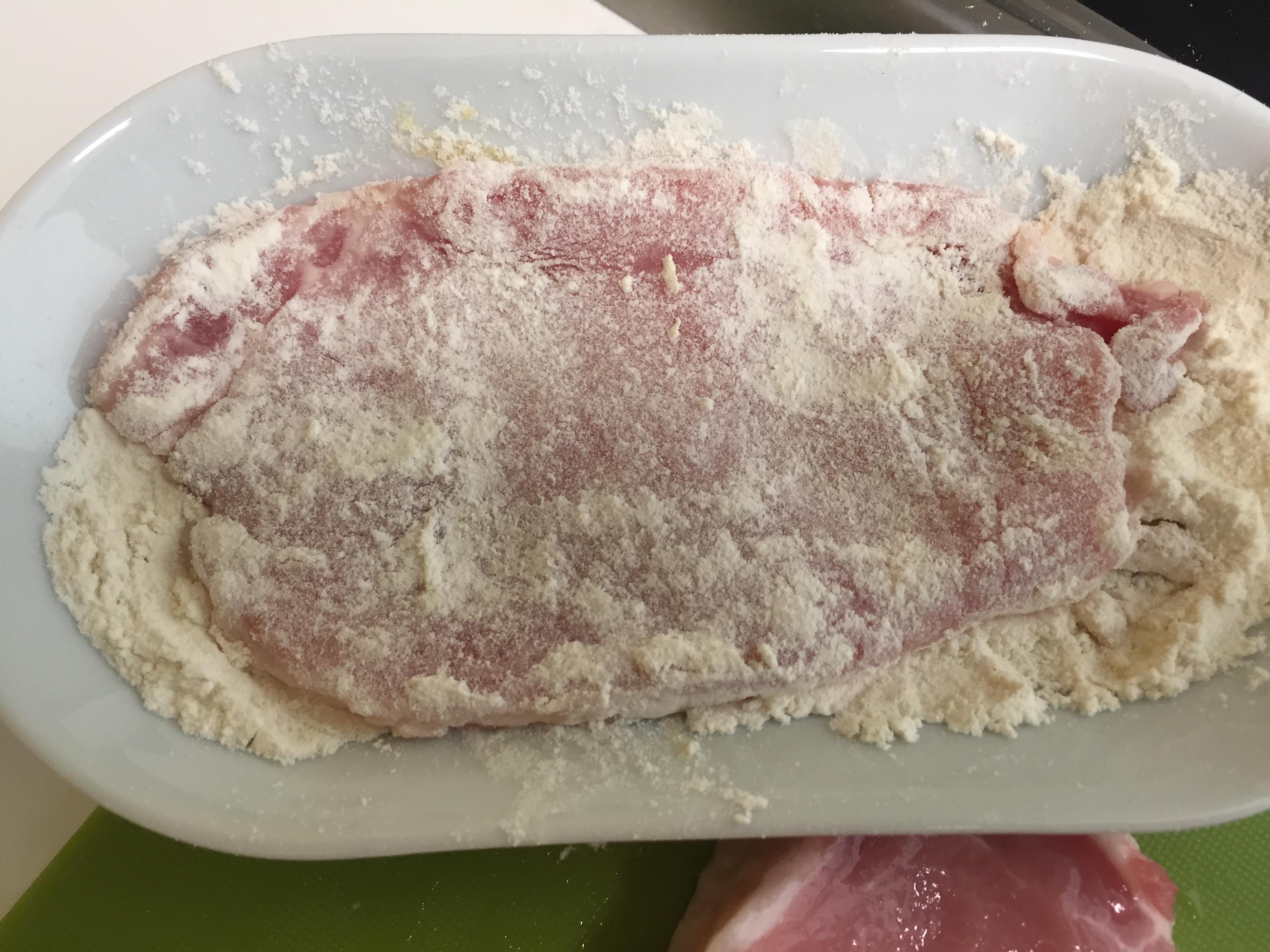 Đánh tan trứng, sau đó nhúng miếng thịt đã lăn qua bột mì vào bát trứng. Cuối cùng lăn thịt qua lớp bột chiên xù hoặc bột từ vụn bánh mì nướng.