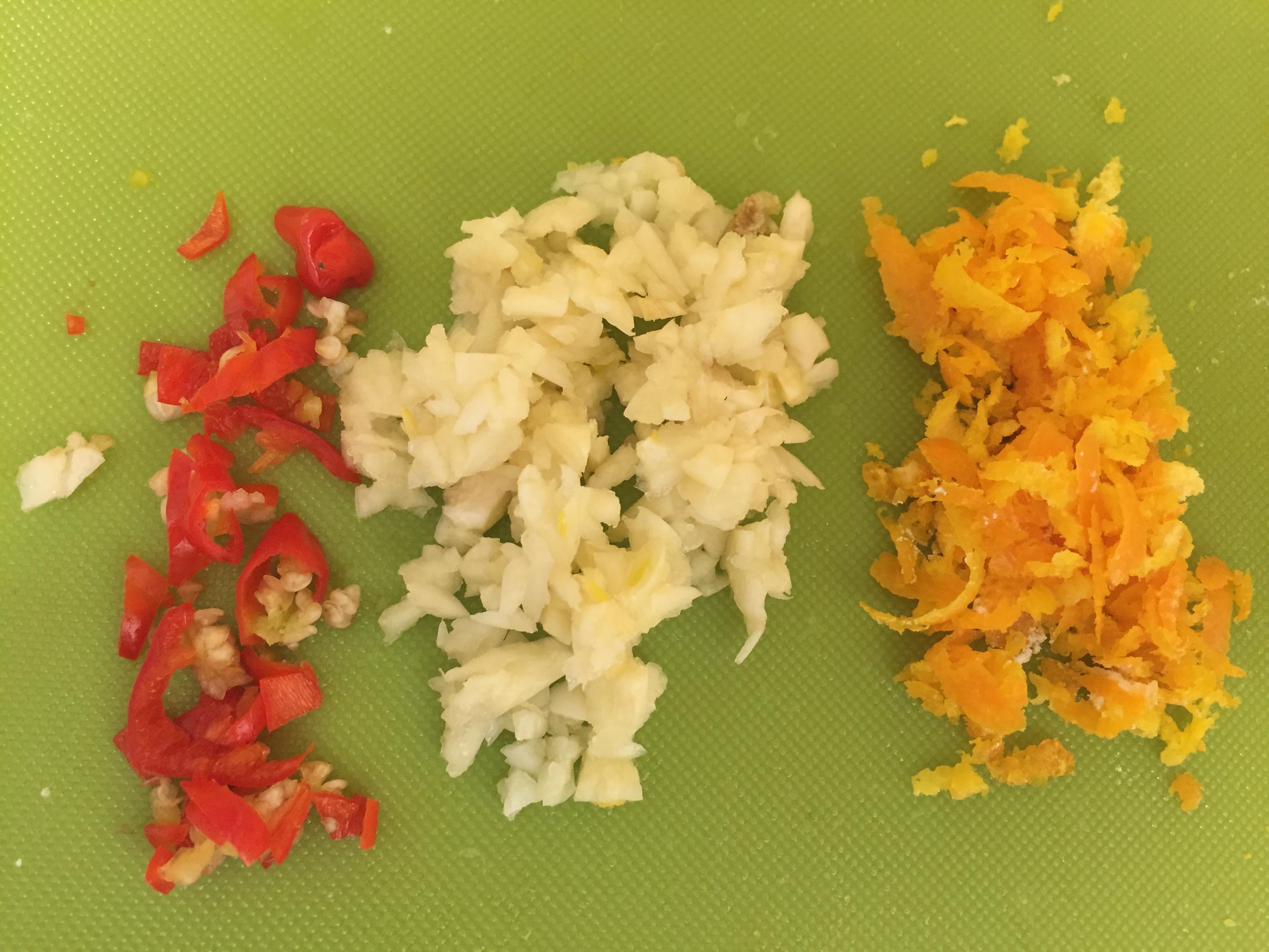 Tỏi băm nhỏ, ớt thái miếng nhỏ, bào khoảng 1/2 vỏ quả cam.