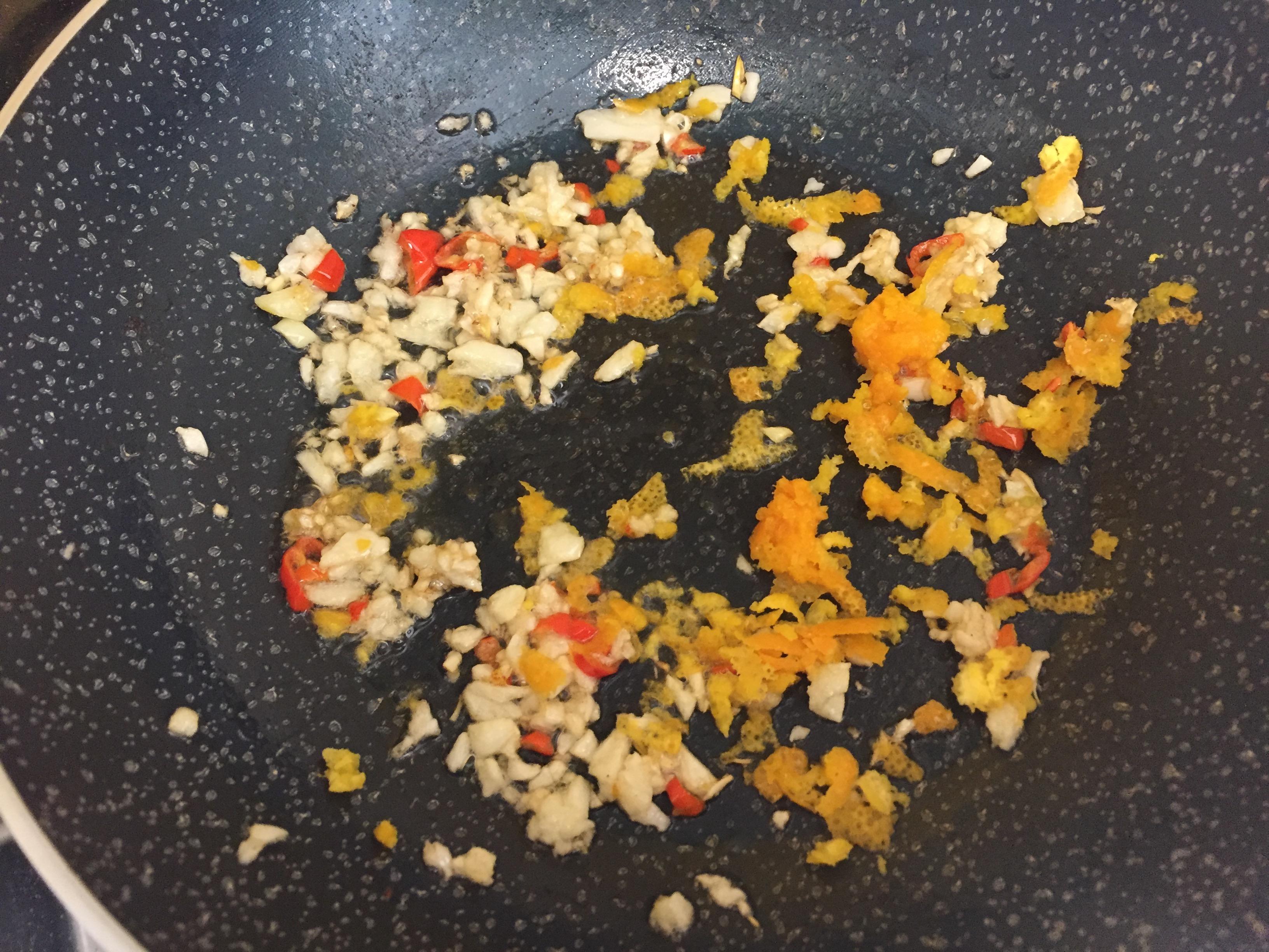 Cho 1 chút dầu ăn vào chảo sau đó cho tỏi và ớt vào đảo cho thơm, tiếp theo cho vỏ cam vào, đảo đều.
