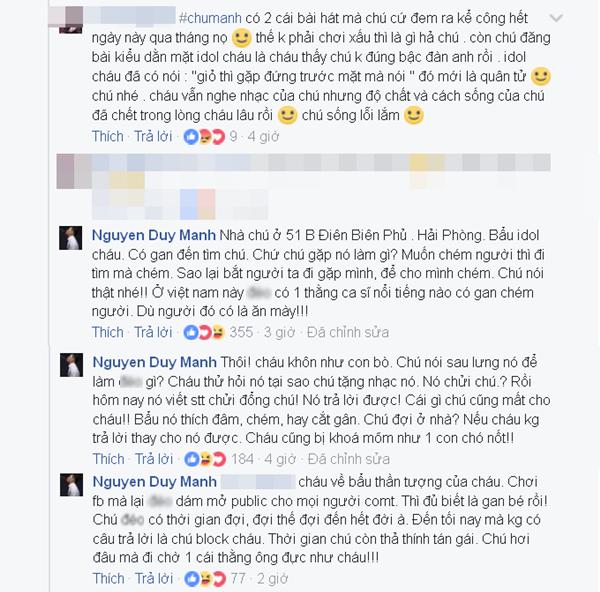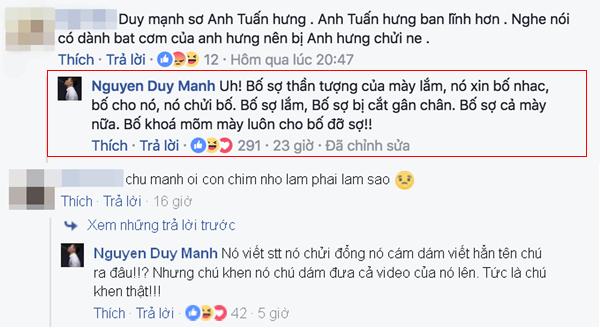 Duy Mạnh cãi nhau tay đôi luôn với fan ruột của Tuấn Hưng. Anh khẳng định chính đàn em