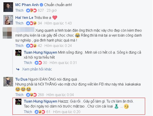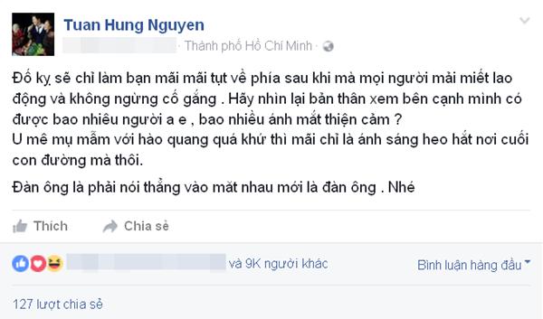 "Đố kỵ sẽ chỉ làm bạn mãi mãi tụt về sau, khi mọi người mải miết lao động và không ngừng cố gắng. Hãy nhìn lại bản thân xem bên cạnh mình có được bao nhiêu người anh em, bao nhiêu ánh mắt thiện cảm? U mê mụ mẫm với hào quang quá khứ thì mãi chỉ là ánh sáng heo hắt nơi cuối con đường mà thôi. Đàn ông là phải nói thẳng vào mặt nhau mới là đàn ông nhé!", Tuấn Hưng viết.