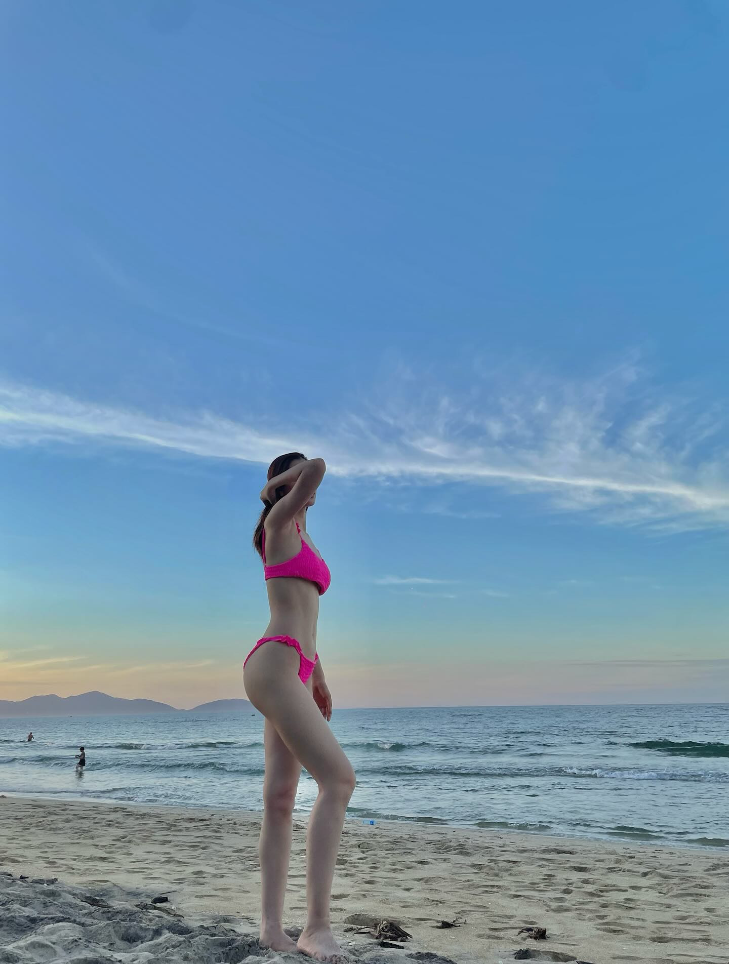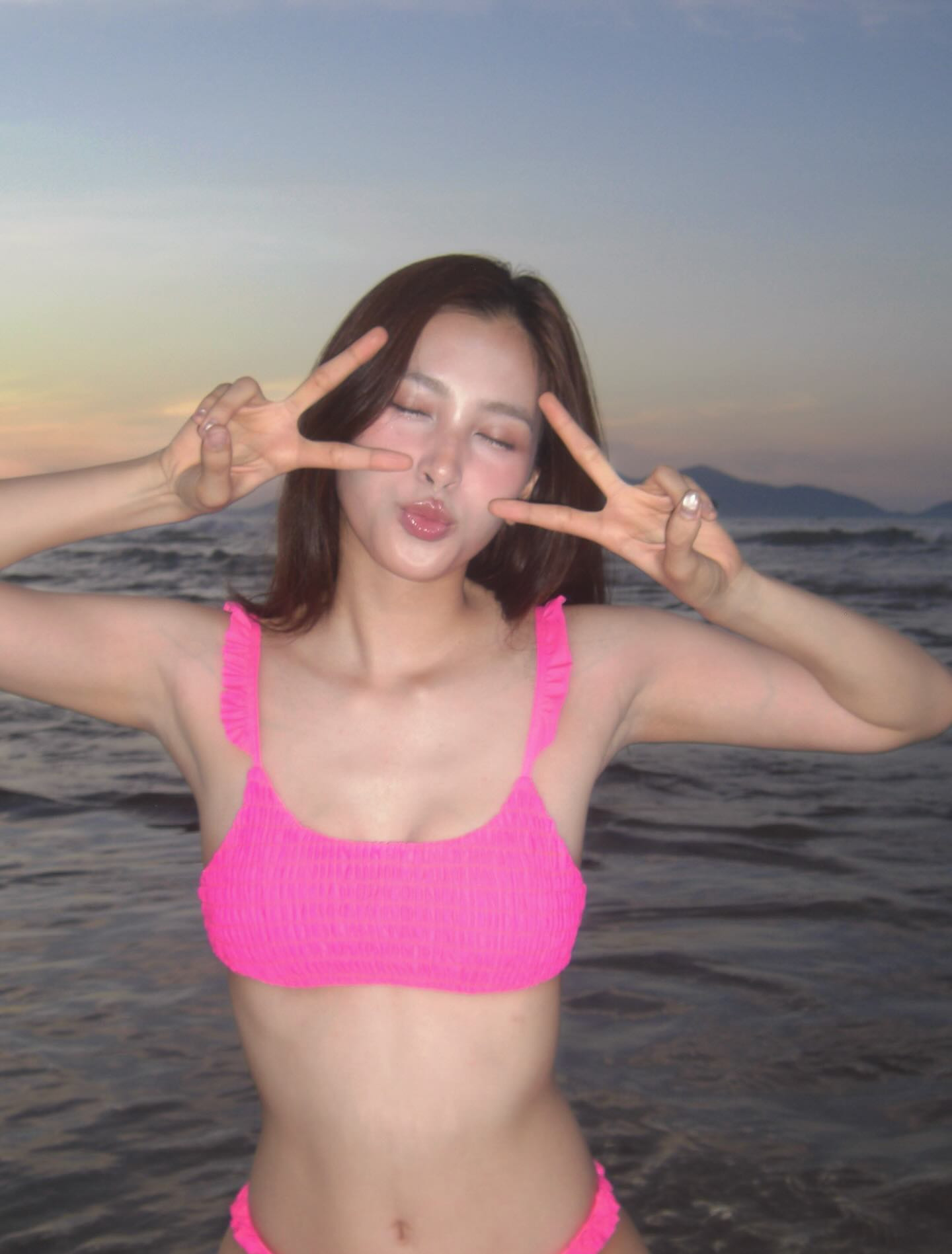 Đặc biệt, thiết kế bikini màu hồng neon nổi bật giúp cô tôn lên làn da trắng sáng và mịn màng.