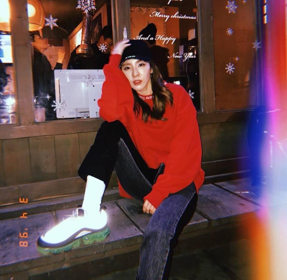 Biểu tượng thời trang và nhan sắc xứ Hàn - Dara khoe street style năng động cùng áo nỉ đỏ và quần jeans kẻ sọc, không thể thiếu giầy sneaker khỏe khoắn cùng mũ lưỡi chai.