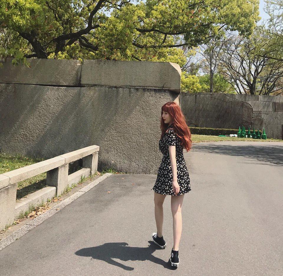 HyunA khoe chân thon nuột nà với váy họa tiết chấm bi trên gối. Nữ ca sĩ kết hợp cùng giầy Converse cao cổ tạo sự năng động.