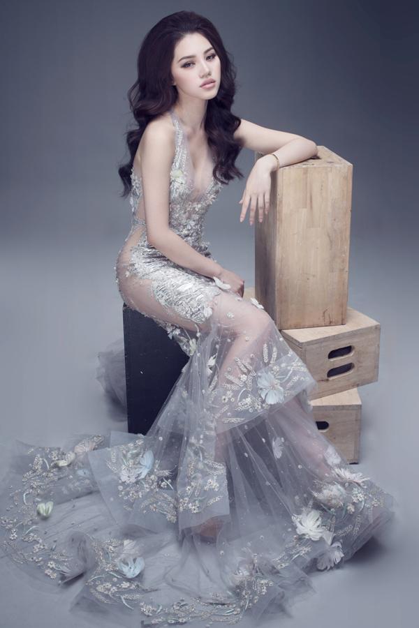 Jolie Nguyễn như hóa thân thành nàng tiên trong váy hàng hiệu trị giá 12.000 USD, đính hoa 3D cầu kỳ. Cô nàng lựa chọn lối trang điểm theo tông màu trong suốt, tô son môi nude, tóc xõa bồng bềnh tự nhiên.