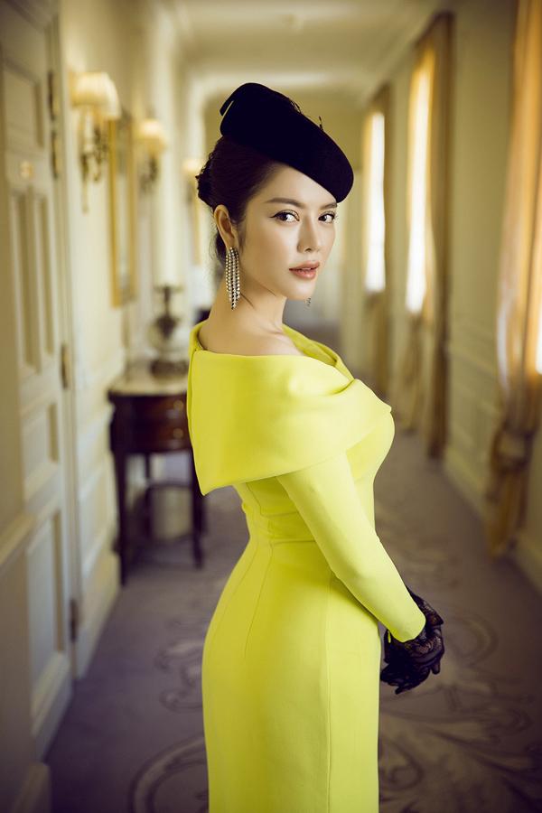 Lý Nhã Kỳ kiêu sa hóa quý cô châu Âu sang chảnh trong thiết kế váy màu vàng neon tôn da nổi bật của NTK Lê Thanh Hòa. "Cô Kỳ" kết hợp với nón đội đầu công nương, găng tay ren ấn tượng.