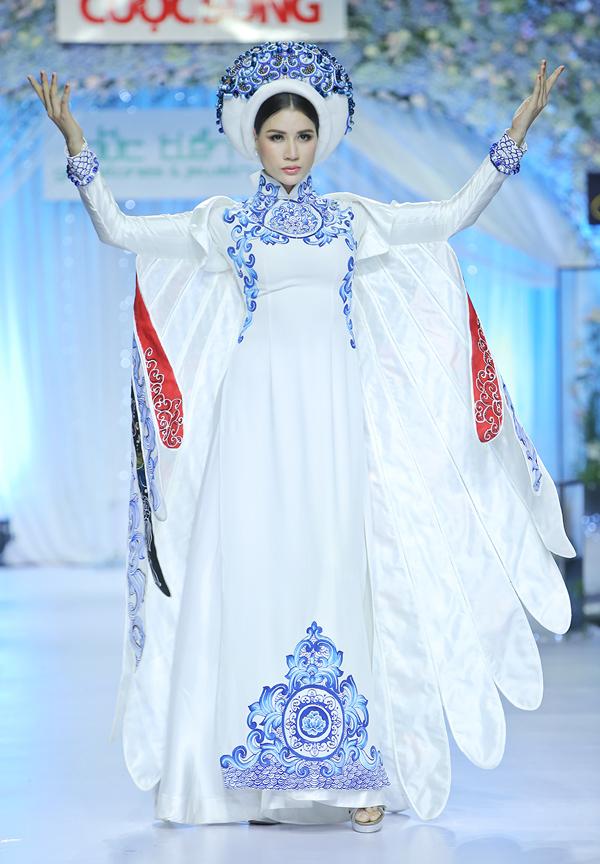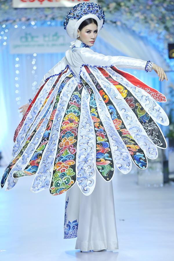 Người mẫu diện áo dài truyền thống cách tân với phần áo choàng cách điệu sau lưng được xếp theo hình cánh quạt với màu sắc, họa tiết độc đáo của NTK Minh Châu.
