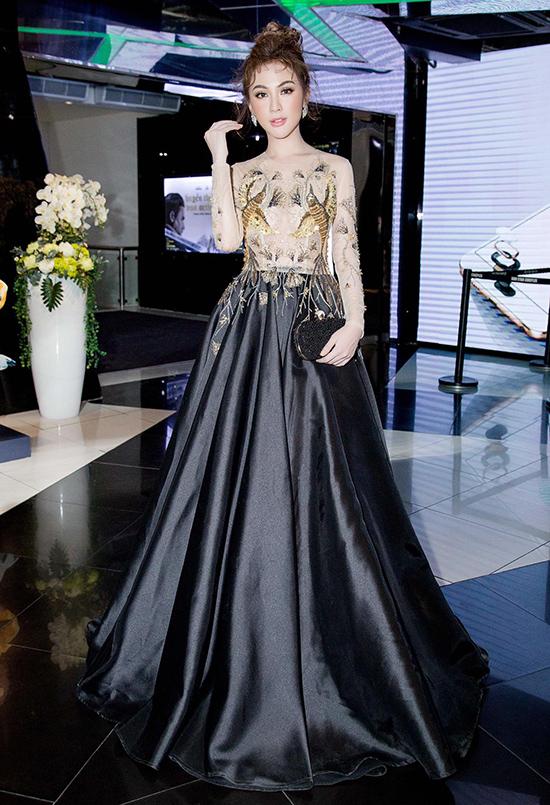 Hot girl Kelly trở thành tâm điểm chú ý tại sự kiện nhờ thiết kế đầm dạ hội trang trí công phu trên nền trong suốt do NTK Đỗ Long thực hiện.