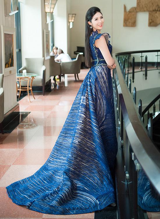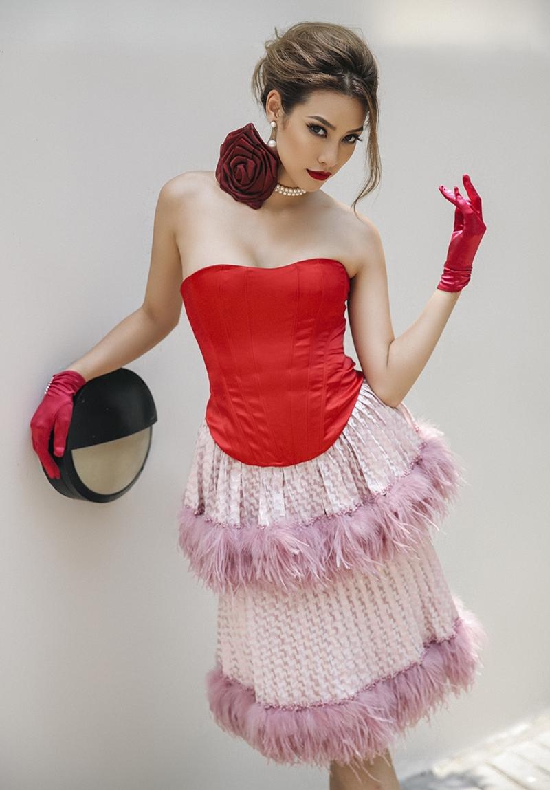Lilly Nguyễn "đốn tim" fans với phong cách tiểu thư đài các đầy quyến rũ, kiêu kì. Đầm xếp tầng với kiểu dáng cúp ngực, có phần giống áo corset gợi nhắc lại hình ảnh tiểu thư quý tộc ở các nước phương Tây thời xưa.