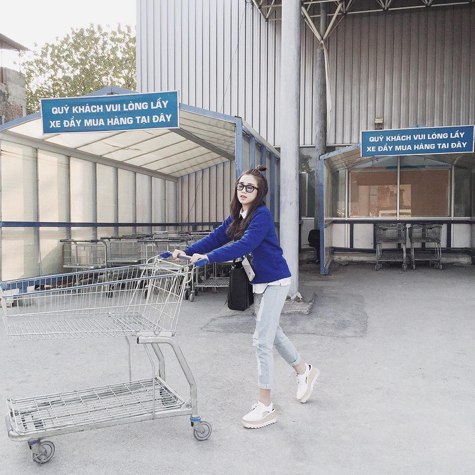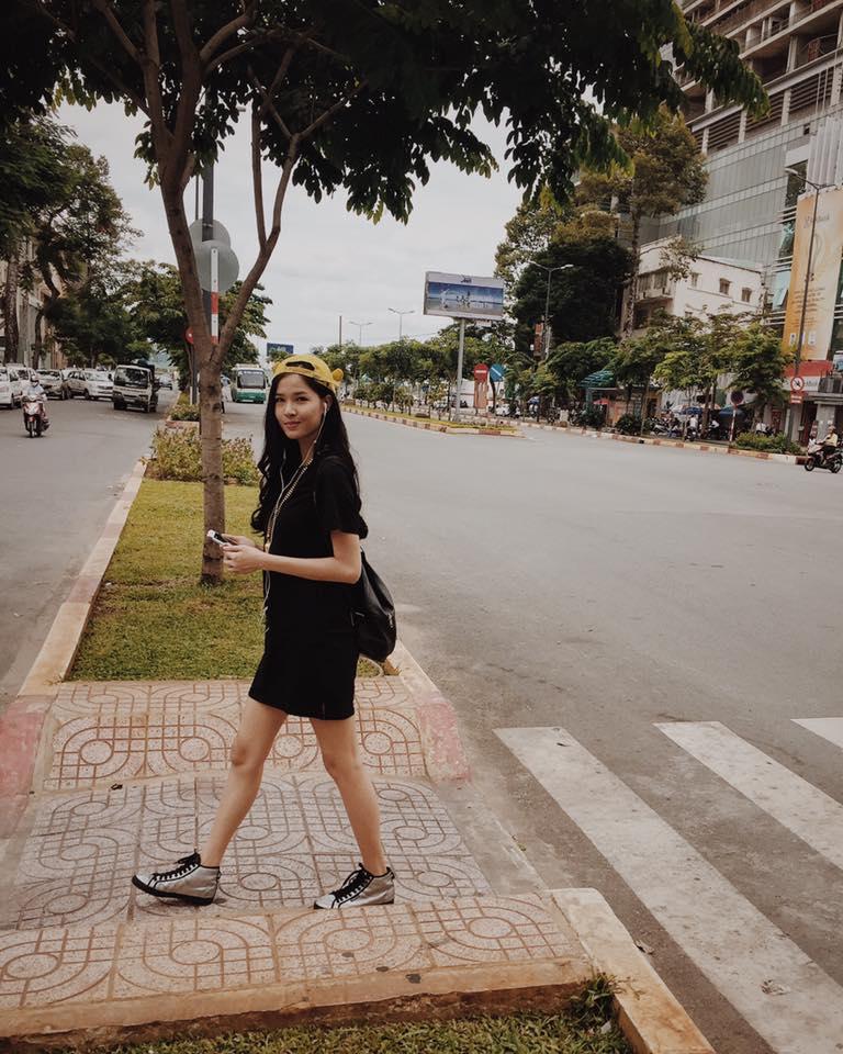 Để thêm nổi bật với cây đen cô nàng chọn giày thể thao trắng đi cùng.