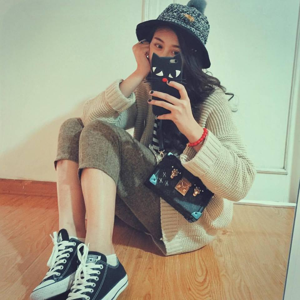 Kỳ Hân năng động với váy ngắn, giày thể thao buộc dây. Mũ cap đội ngược,