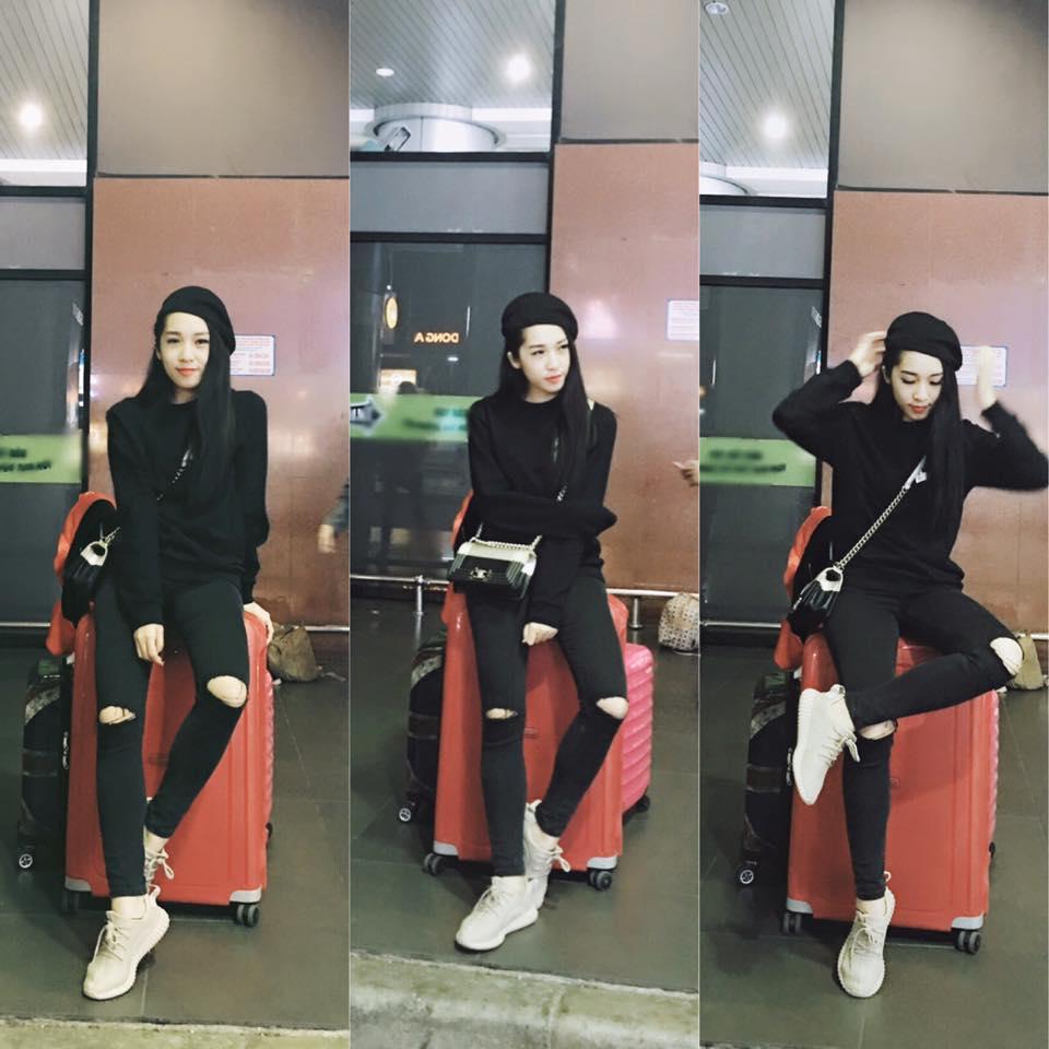 Emily Nguyễn xuất hiện ở sân bay với áo phông đen, quần skinny rách cùng tông.