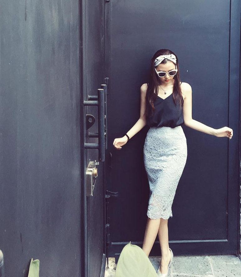 Midu khoe vẻ đẹp nữ tính và không kém gợi cảm với áo hai dây đen kết hợp cùng chân váy bút chì chất liệu ren dáng dài. Chiếc băng đô dễ thương là phụ kiện thường xuyên được Midu lựa chọn.
