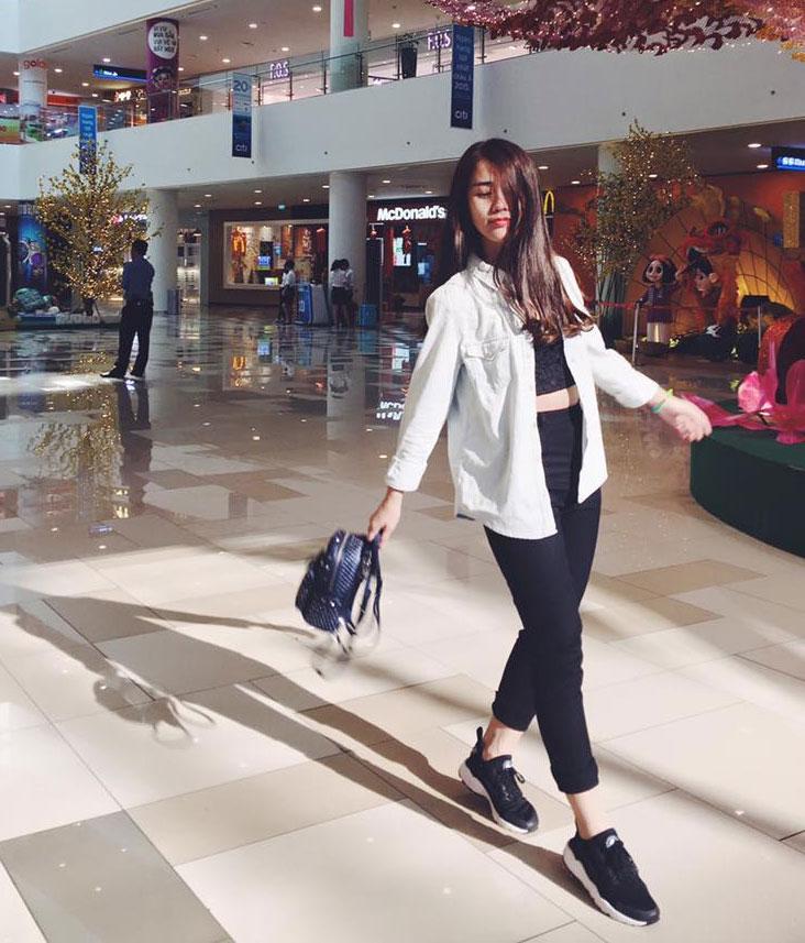 Tú Linh diện áo hai dây, quần short khỏe khoắn và giày slip-on để dạo phố.