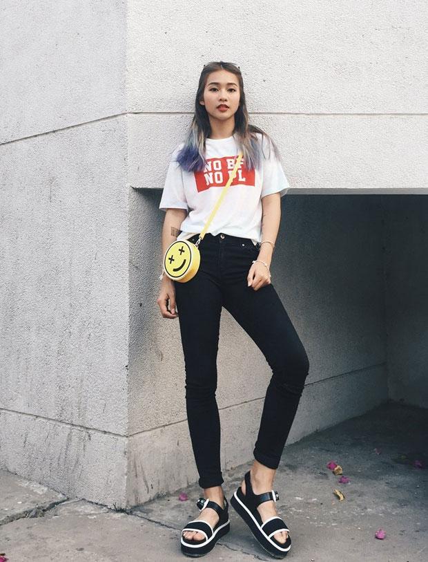 Áo phông trắng cổ tròn, quần skinny đen, sandals quai to là item thường xuyên được Khả Ngân yêu thích.