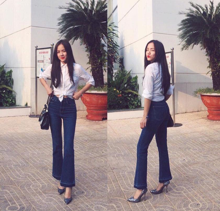 Áo sơ mi trắng thêm phong cách khi được Phương Ly buộc vạt lộ eo thon gọn. Chiếc quần jeans ống loe và đôi giày mũi nhọn cao gót giúp Phương Ly tôn chiều cao đáng kể.