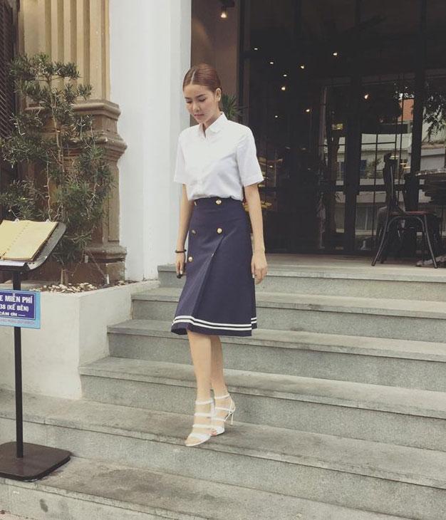 Ở một set đồ khác chân dài Venus lại khá dịu dàng, thanh lịch với áo sơ mi trắng,