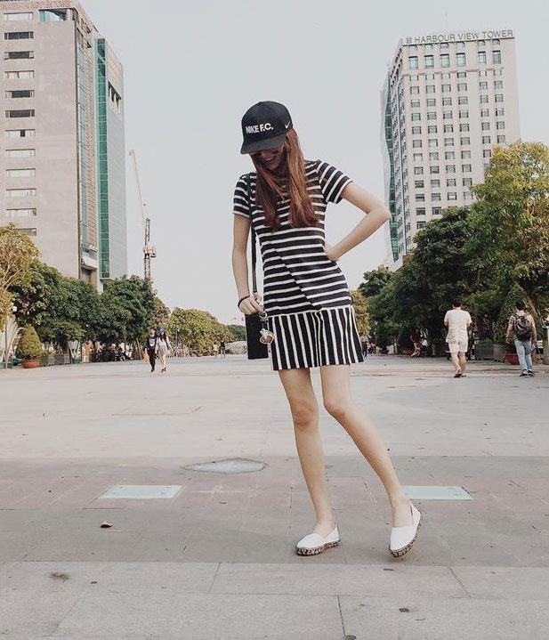 Dáng váy đơn giản nhưng khá hiện đại được cô kết hợp cùng giày slip-on