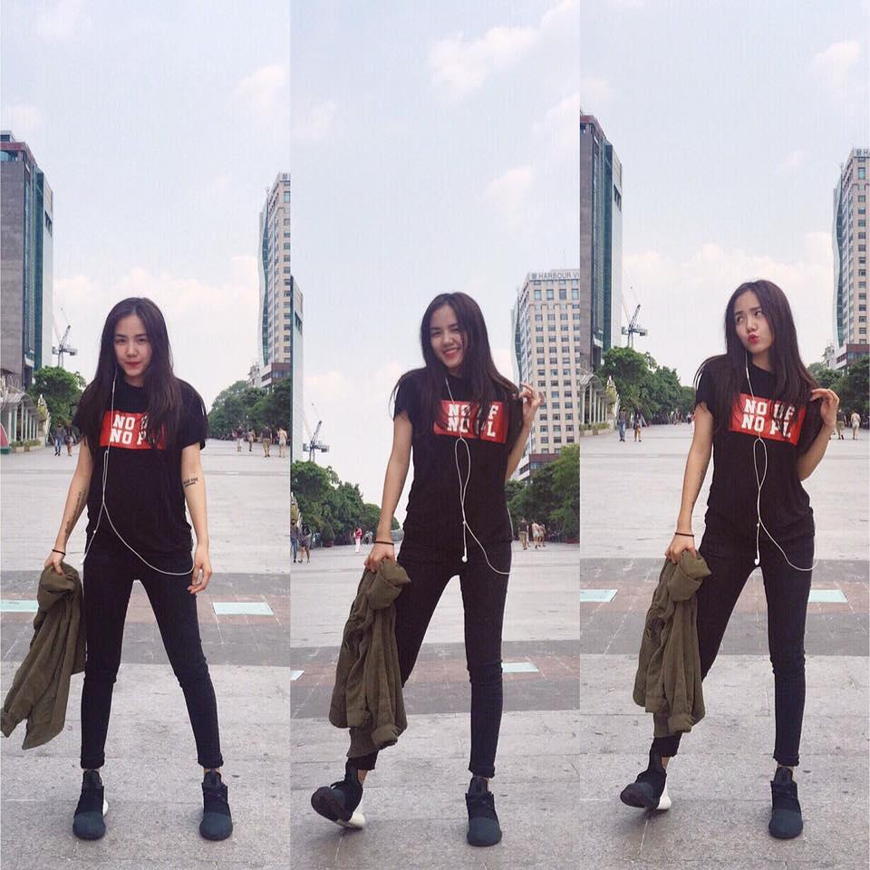 chữ, quần skinny xắn gấu và giày thể thao.