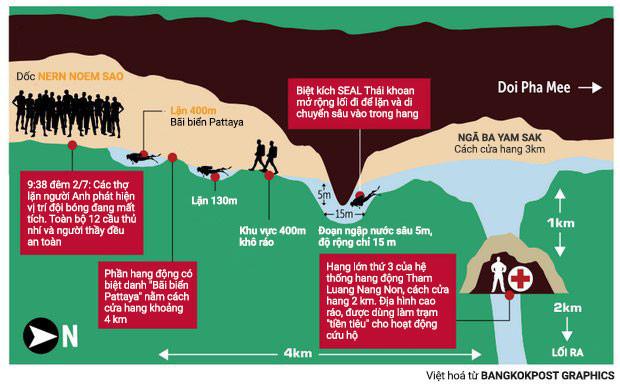 Sơ đồ chiến dịch giải cứu đội bóng bị kẹt trong hang Tham Luang. Đồ họa: Bangkok Post.