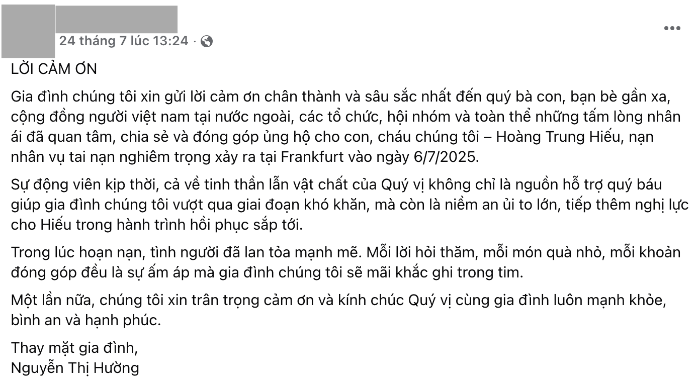 "Gia đình tôi xin gửi lời cảm ơn chân thành và sâu sắc đến quý bà con, bạn bè gần xa, cộng đồng người Việt Nam tại nước ngoài, các tổ chức, hội nhóm và toàn thể tấm lòng nhân ái đã quan tâm, chia sẻ và đóng góp ủng hộ cho con, cháu chúng tôi là Hoàng Trung Hiếu, nạn nhân vụ tạn nạn nghiêm trọng xảy ra vào ngày 6/7 vừa qua.