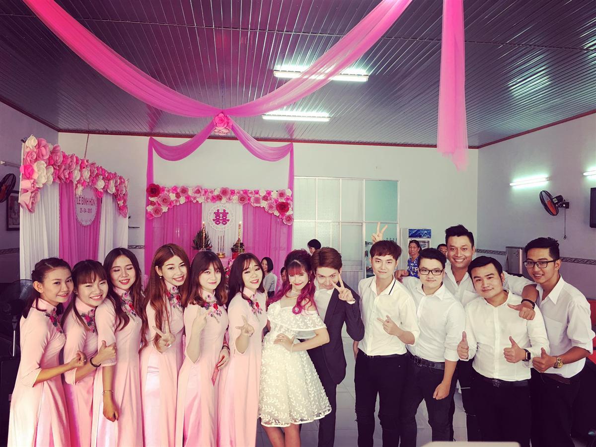 Cặp đôi chụp hình cùng dàn nam thanh nữ tú trong lễ đính hôn.