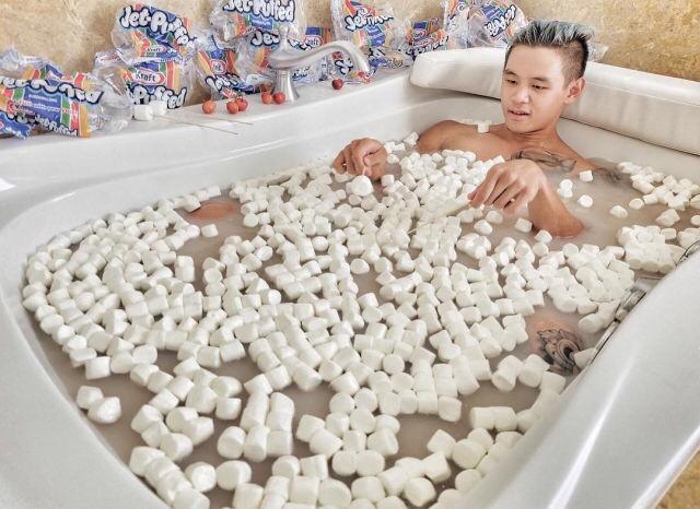 Hết trò tiêu khiên, thiếu gia trẻ người Singapore nghĩ ra việc tắm cùng kẹo dẻo Marshmallow