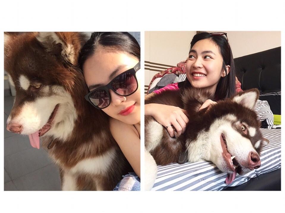 Trâm Anh bên JustaTee và cún cưng mà hai người cùng chăm sóc