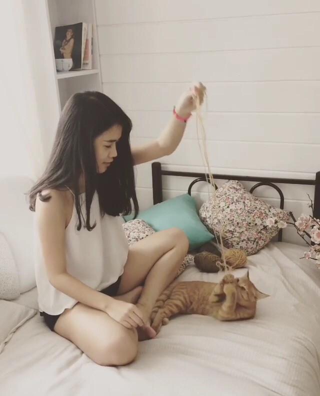 Sau những giơ diễn căng thẳng, cô thoải mái nô đùa bên hai chú mèo cưng của mình