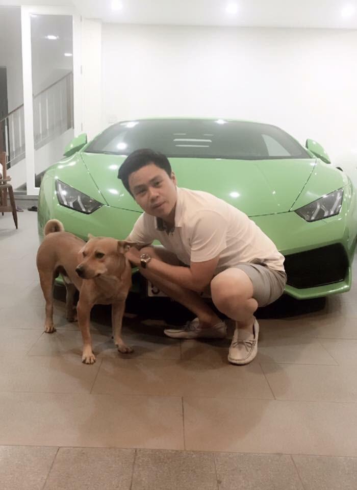 Phan Thành cùng chú chó cưng của mình bên chiêc Lamborghini Huracan