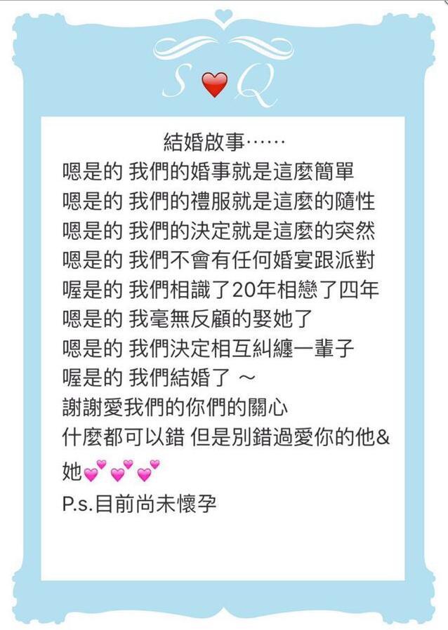 Trong thông báo kết hôn của hai người có viết: "Hôn sự của chúng tôi chính là đơn giản như vậy đấy. Lễ phục của chúng tôi cũng chính là "tùy hứng" như vậy đấy. Quyết định của chúng tôi chính là bất ngờ như vậy đấy. Chúng tôi không hề có bất cứ tiệc cưới hay "party" nào cả. Chúng tôi đã quen biết nhau 20 năm rồi, và yêu nhau cũng được 4 năm. Tôi đã hẹn hò với cô ấy một cách ngẩng cao đầu. Chúng tôi quyết định sẽ gắn bó cả cuộc đời này với nhau. Chúng tôi kết hôn rồi!".