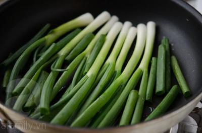Làm nóng chảo với dầu ăn. Xếp ít nhánh hành lá vào chảo.