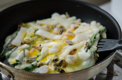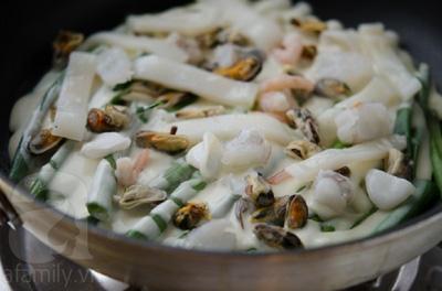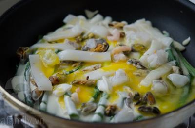Sau đó rải đều ít tôm và mực đã chế biến sẵn vào.