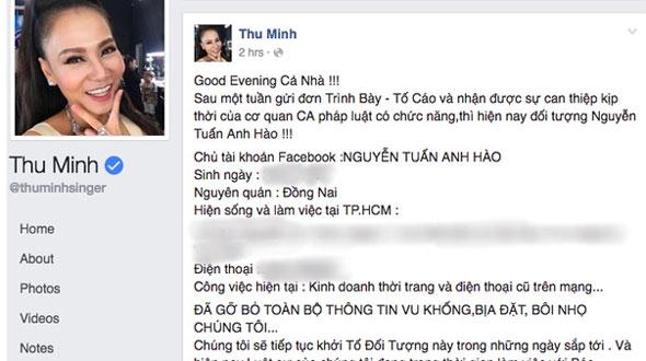 Thu Minh khẳng định, sau một tuần gửi đơn trình bày, tố cáo và nhận được sự can thiệp kịp thời của cơ quan công an pháp luật có chức năng, thì hiện nay danh tính của đối tượng đã bêu xấu gia đình cô là Nguyễn Tuấn Anh Hào (sinh năm 1995) đồng thời cũng là chủ tài khoản Facebook: Nguyễn Tuấn Anh Hào. Nữ ca sĩ sinh năm 1977 cũng khẳng định, người đó đã gỡ bỏ toàn bộ thông tin vu khống, bịa đặt, bôi nhọ gia đình cô trong thời gian qua. Thu Minh cũng không quên đề cập tới chuyện sẽ khởi tố người này trong thời gian tới.