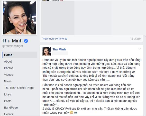 Hơn nữa, Thu Minh khẳng định "Danh dự và uy tín của một doanh nghiệp được xây dựng dựa trên nền tảng những hợp đồng được thực thi đúng với những giao kèo, mua và bán hàng hóa có chất lượng theo đúng quy định trong hợp đồng....Vì thế, đừng vì không còn đường nào để 'níu kéo dư luận' mà đem lí do vì tin tưởng Uy tín một bà ca sĩ chỉ biết hát, không biết gì về kinh doanh mà "đổi trắng thay đen" cho sự Gian dối hay yếu kém của mình....