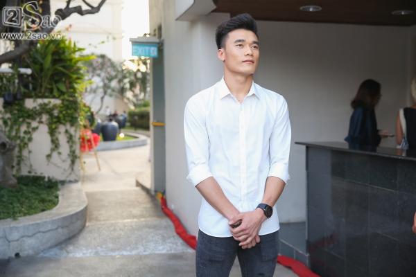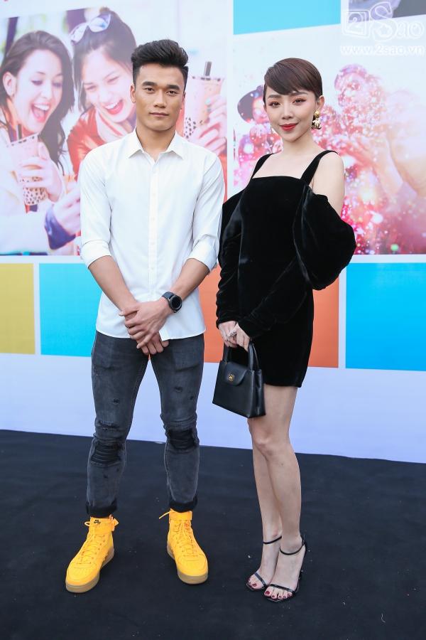 Đứng cùng người đẹp là ca sĩ Tóc Tiên, Tiến Dũng vẫn giữ phong cách điềm đạm và tạo dáng chắp tay quen thuộc.