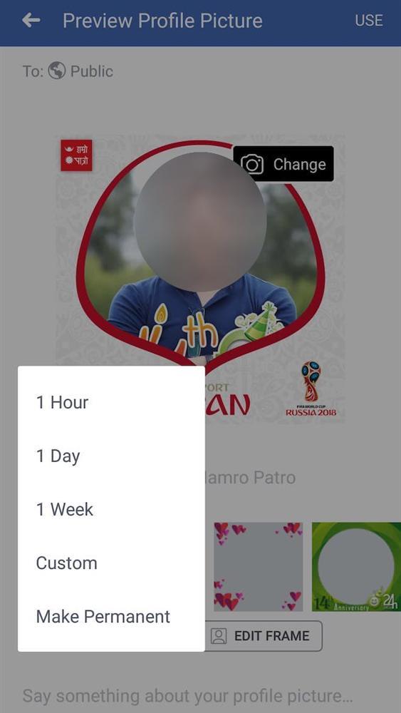 Có thể tùy chỉnh thời gian có hiệu lực của khung hình World Cup trước khi trở lại ảnh đại diện cũ. Xong, nhấn Use.