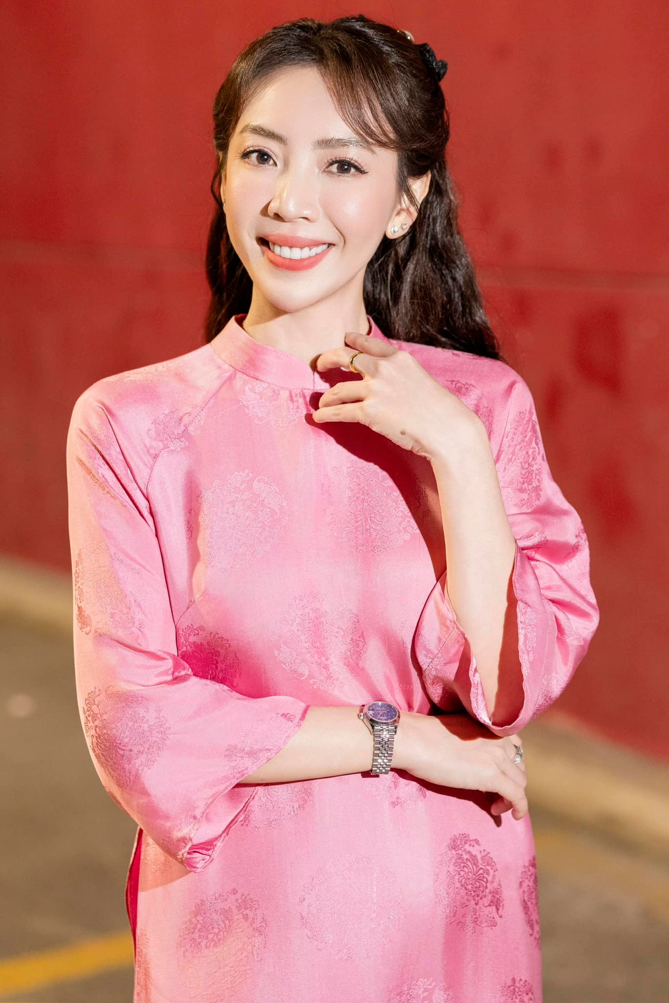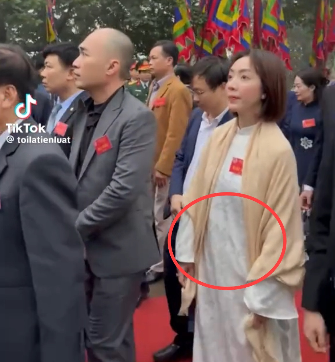 Nữ diễn viên diện trang phục áo dài trắng dáng suông, khéo léo khoác thêm khăn vừa để giữ ấm vừa giấu dáng. Tuy nhiên, ở một vài khoảnh khắc, bà xã Tiến Luật vẫn để lộ chiếc bụng lùm lùm vướng nghi vấn bầu bí lần hai.