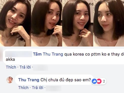 Điều này dấy lên nghi ngờ trong chuyến đi Hàn Quốc vào đầu tháng 4 vừa qua, Thu Trang can thiệp dao kéo để có được vẻ ngoài xinh đẹp. Ở cuộc trò chuyện với fans trước đó, khi được hỏi khéo về việc "dao kéo" trùng tu nhan sắc, Thu Trang khép léo phủ nhận bằng câu nói bất hủ của Phi Thanh Vân tại Hoa hậu Doanh nhân Thế giới để đối đáp: "Chị chưa đủ đẹp sao em?".