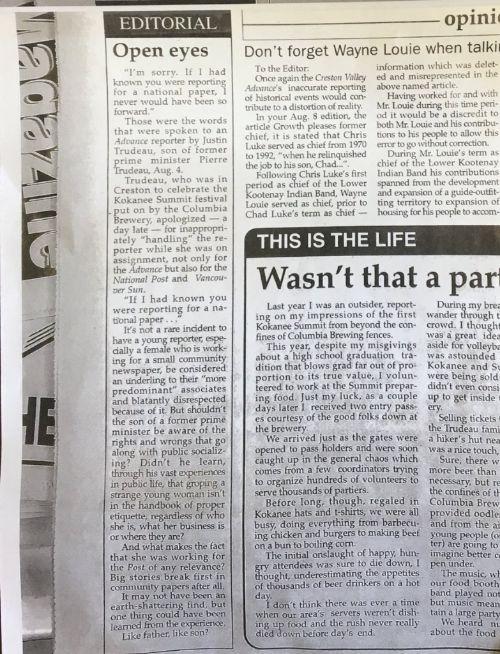 Bài viết "Open eyes" trên tờ Creston Valley Advance tố ông Trudeau đã sàm sỡ một nữ phóng viên của báo này. Ảnh: Twitter.