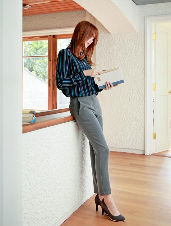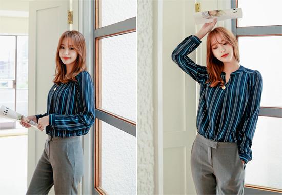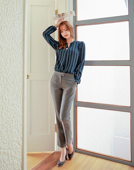Một chiếc áo sơ mi kẻ sọc màu xanh đen kết hợp với quần tây màu ghi và giày cao gót sẽ khiến bạn đẹp toàn diện, thanh thoát hơn bao giờ hết. Ngoài trang phục, bạn nên tô điểm cho mình một chút son môi, phấn mỏng nhẹ tự nhiên để giúp gương mặt bừng sáng ngày đầu tuần đi làm.