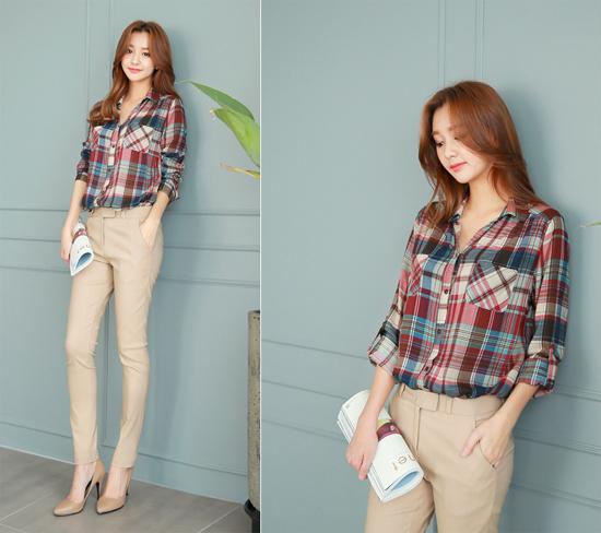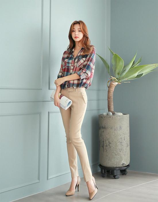 Khi diện quần tây màu nhã nhặn, bạn nên lựa chọn cho mình chiếc áo sơ mi kẻ caro bắt mắt. Thiết kế áo có túi trước ngực sẽ tạo cho bạn vòng một thêm đầy đặn, cuốn hút.