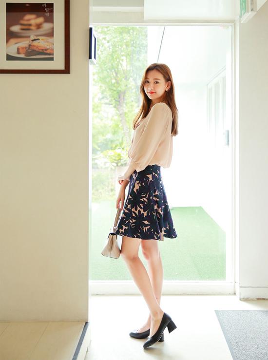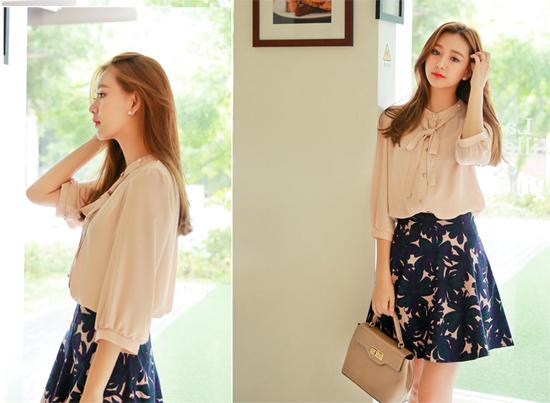 Áo sơ mi với phần cổ thắt nơ mềm mại là một trong những xu hướng mạnh mẽ nhất trong suốt thời gian vừa qua. Bạn sẽ rất duyên dáng, dịu dàng khi lựa chọn áo sơ mi màu nude kết hợp với chân váy họa tiết hoa dáng xòe.