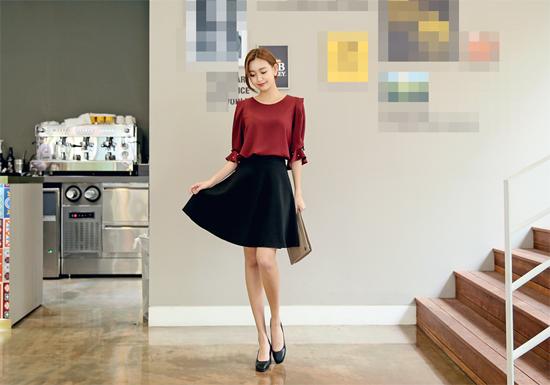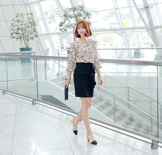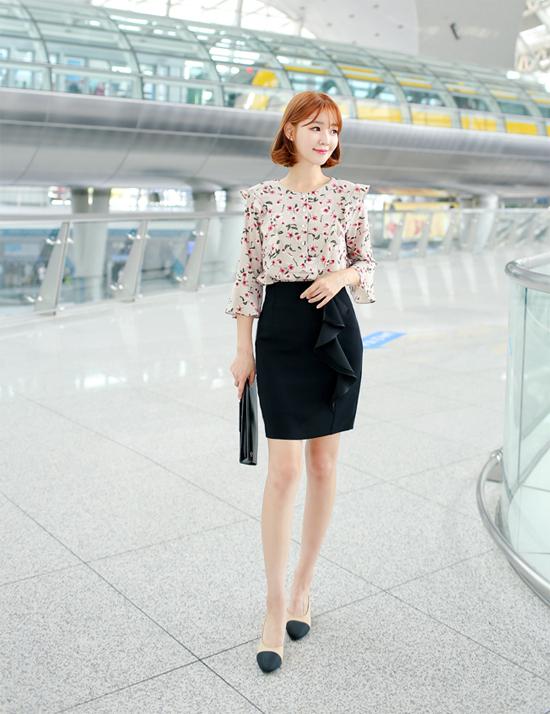Những cô nàng dáng người mảnh dẻ, nên chọn áo sơ mi họa tiết thiết kế tay loe đi cùng chân váy bút chì, đường diềm "bánh bèo" phía trước. Bộ đôi giày cao gót, clutch sẽ tô điểm cho vẻ ngoài của bạn hoàn hảo nhất.